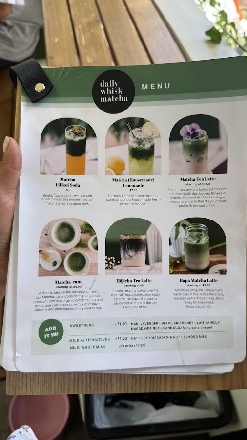 Nestled in the lively Kaimuki neighborhood, Daily Whisk Matcha is a recent arrival that's already catching the attention of Honolulu's matcha and coffee aficionados. You'll find this specialty spot thoughtfully situated inside the Ten Tomorrow boutique on 11th Avenue, making it a convenient and unique find for those exploring the area. Their core focus is clear: to provide a dedicated experience centered around high-quality matcha and coffee drinks. As a new business, Daily Whisk Matcha brings a fresh perspective to Kaimuki's diverse culinary landscape. While specific details about their history or a unique mission are still emerging, their specialization in both matcha and coffee sets them apart. The unique co-location within a boutique adds an interesting dimension to the visit, offering a pleasant stop for refreshment while browsing. For anyone seeking a carefully prepared matcha or a satisfying coffee in a distinctive setting, Daily Whisk Matcha presents itself as a promising new destination worth discovering.